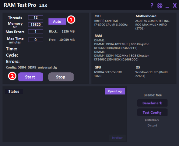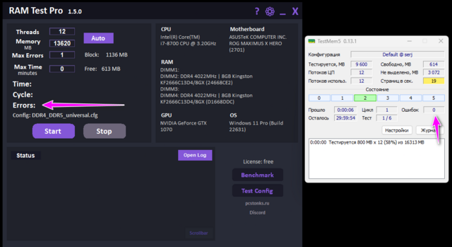 Самый простой вариант протестировать память – RAM Test Pro от PCstonks. Качаете, закрываете весь фоновый софт (браузер, steam и т.п), нажимаете «Auto», затем «Start» и не пользуетесь ПК во время тестирования. В графе Max Errors можете выставить единицу. Для полноценной проверки памяти потребуется не менее трёх часов, но какие-то критичные проблемы в работе ОЗУ программа выявит уже на первых 30 минутах. Что в первой, что во второй программе, показатель успешно пройденного теста – ни единой ошибки в графе «Errors / Ошибки». Если есть хотя бы одна ошибка, значит память работает некорректно (по разным причинам) и так оставлять работать ПК нельзя, нужно искать причину. По большому счёту, это всё, что вам нужно, чтобы проверить память на стабильность. Если по какой-то причине у вас не работает софт, либо не хотите пользоваться конкретно этой утилитой, есть: