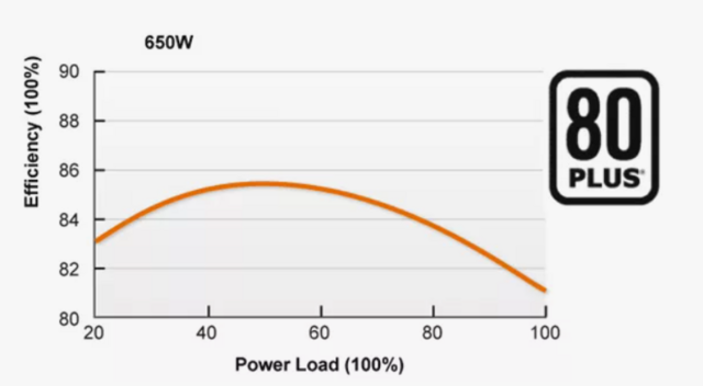 Это запас. КПД блока питания зависит от сертификата. Самая высокая эффективность блока питания начинается от 40% до 70% загрузки +/-, в зависимости от конкретной модели. Примерно, вот так: