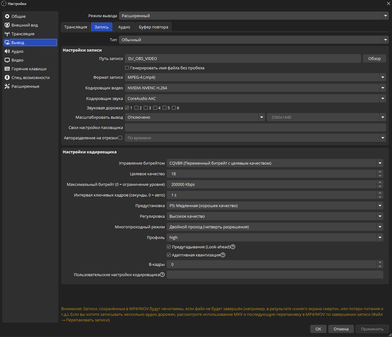 Вот хорошие настройки для записи. Протестировано сто раз, можно копировать ничего не меняя, но если записываете в 4К60, то лучше выставить пресет P1 (качество не ухудшится, просто понадобится больше битрейта).
