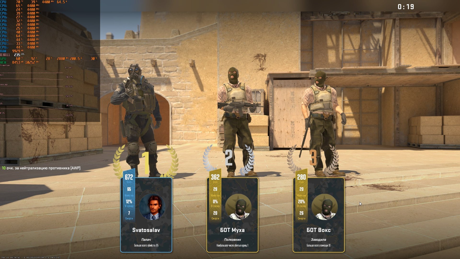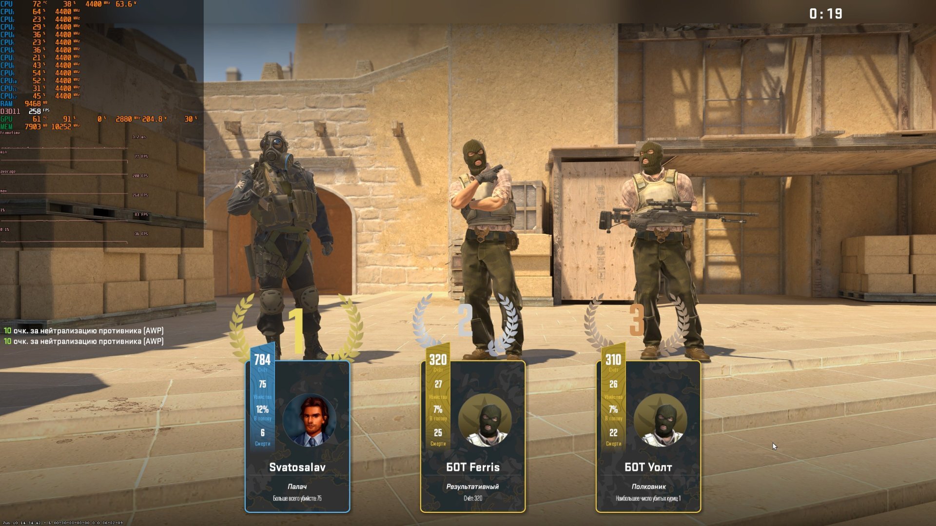 @Svatosalav Сделайте тест CPU-Z Benchmark. Что-то странное. Понятно, что с ботами FPS ниже, но должно быть ~250-300 кадров в среднем, по идее.