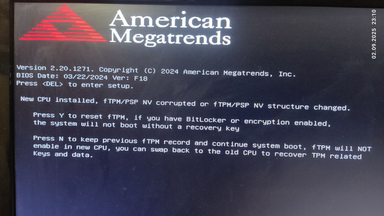 Появляется надпись New CPU installed, fTPM/PSP NV corrupted or fTPM/PSP NV structure changed. Gigabyte A520M S2H
