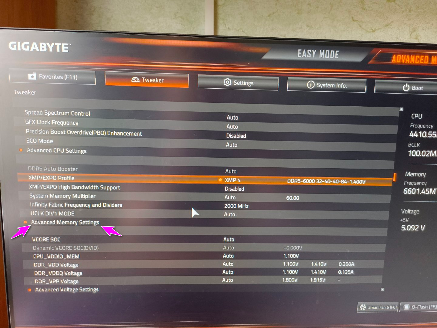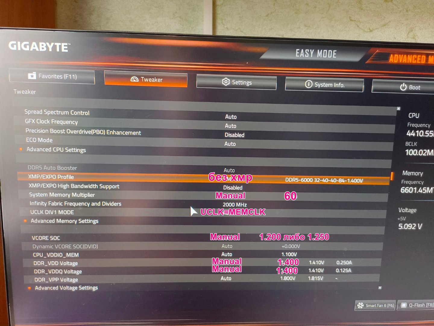 Очевидно же, что когда память в стоке всё прекрасно работает, значит дело в настройке памяти. Если вот прям совсем стабильно и нет ни единого проявления проблемы при выключении XMP, то как я написал выше, надо вручную настроить частоту, тайминги и напряжение. Напряжение на главной странице раздела Tweaker – DRAM_VDD и VDDQ – 1.400v. Там же частота памяти System Memory Multilpayer. Число – это множитель. 60х100= 6000 МГц. Если хотите частоту 6000, значит множитель 60.