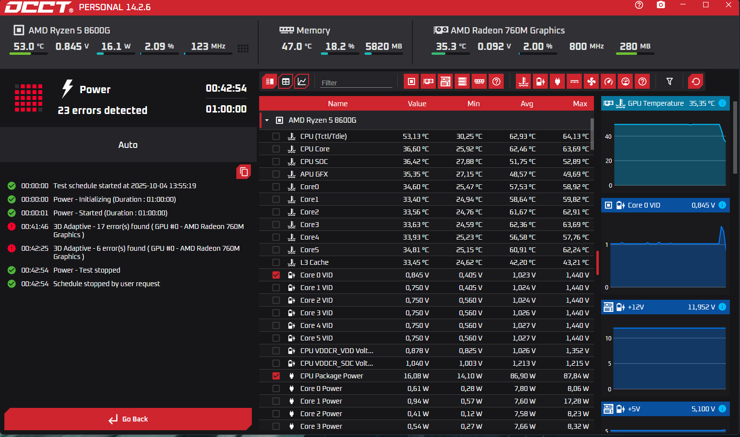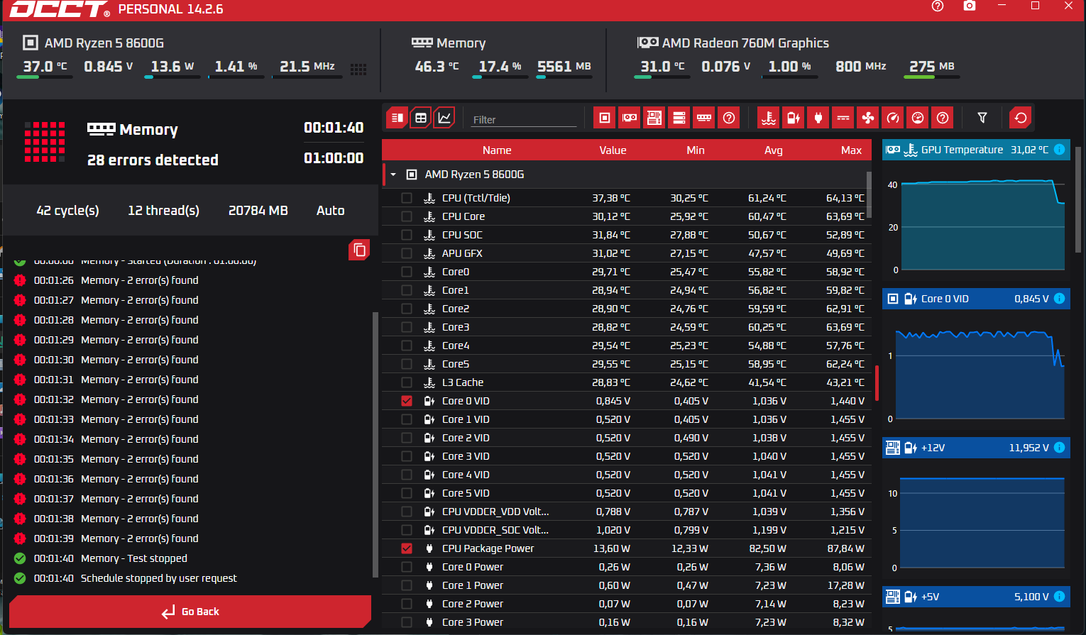 Также проверил на остальных частотах - ошибки питания сразу, а вот ошибки памяти, как мы выяснили - через некоторый промежуток времени.