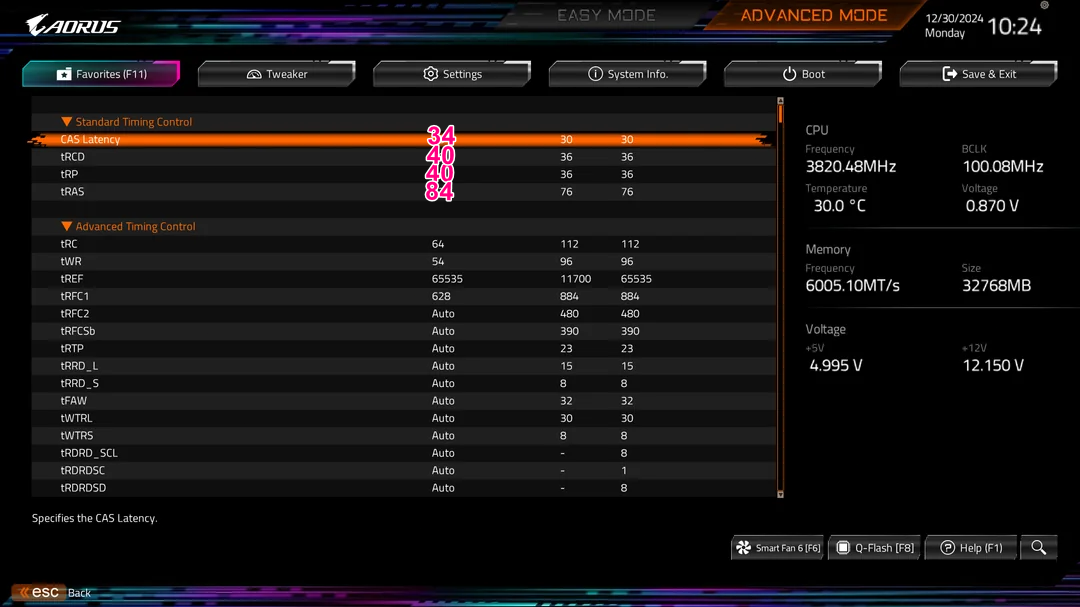 Если захочется большей производительности памяти, можно попробовать CAS 30, tRCD 38, tRP 38, tRAS 68.