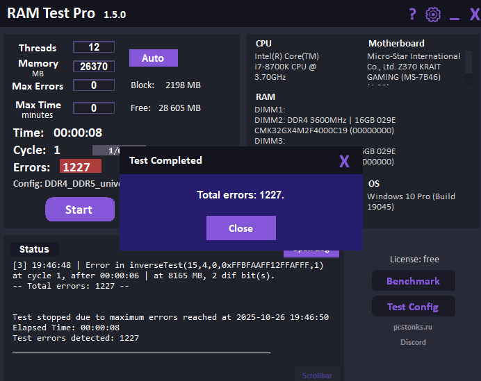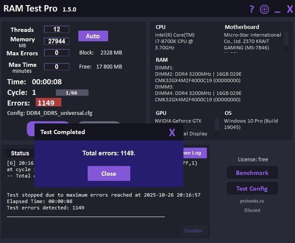 И на 3200 МГц вылетает? Если так, значит либо одна из планок памяти сбойная, либо контроллер памяти деградировал. У меня I7 8700, который сейчас в лёгкую с памятью ~4000 МГц работает, так что это возможно. Просто какой-то дефект образовался.