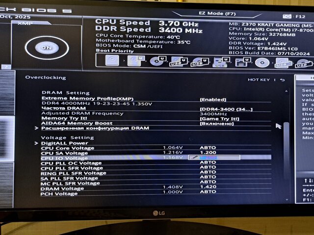 Затем заходите в BIOS, включайте XMP на 4000 МГц. Напряжение на VCCIO и VCCSA ставьте ~1250 мВ