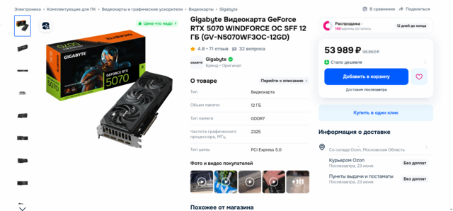 Видеокарта GIGABYTE RTX 5070 WINDFORCE OC SFF за 60 000 рублей в DNS