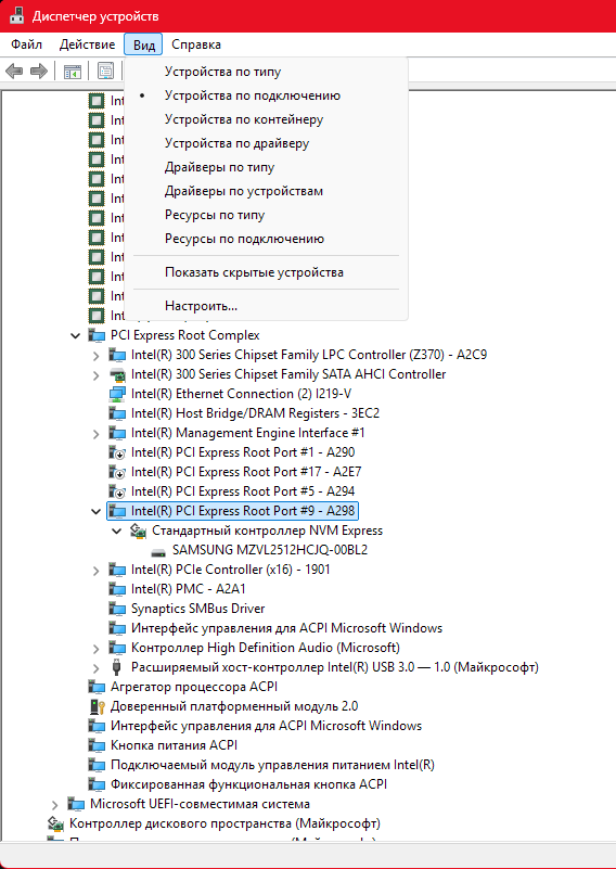 Можно нажать левой кнопкой мыши на NVME диск, затем сверху «вид» → Устройства по подключению и удалить драйвер, который самый первый в ветке