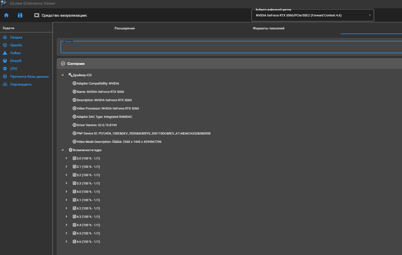 1.  Видеокарта  RTX 5060 Ti  поддерживает OpenGL 4.6, что означает, что она способна работать с любыми версиями OpenGL вплоть до 4.6.