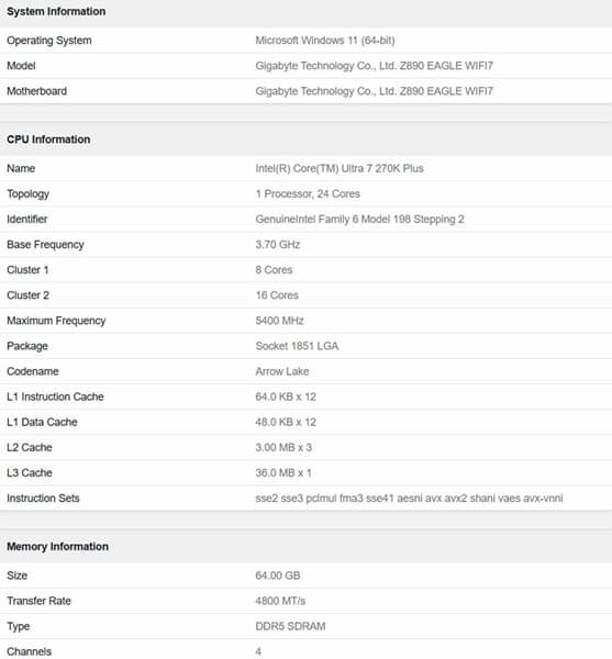 Intel Core Ultra 7 270K опережает Core Ultra 7 265K на 5% в тесте Geekbench