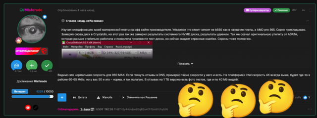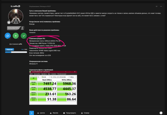 Очень сильно рад за вас, но как это помогает решить мою проблему я не понимаю. В любом случае у нас разные платы, разные процы (насколько я понимаю) и то что у вас цифры во много раз больше моих никак не отвечает на мой вопрос. Проблема в итоге в моем SSD или в моей платформе конкретно и настолько ли у меня низкие значения что бы это серьезно влияло на поведения в играх?