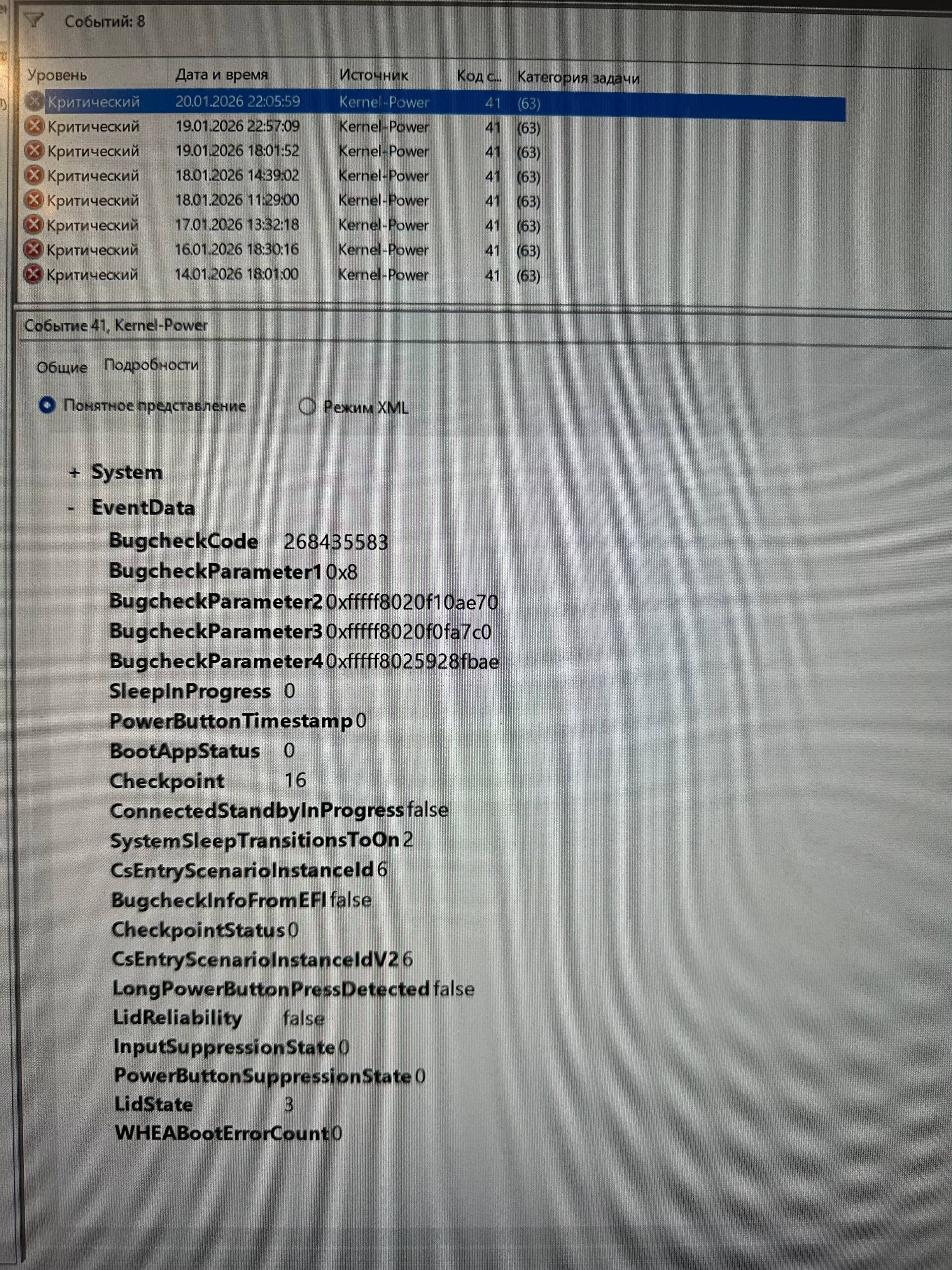 Привет. К сожалению, ошибка Kernel-Power 41 (63) говорит лишь о том, что компьютер был нештатно выключен. Больше ни о чём не говорит.