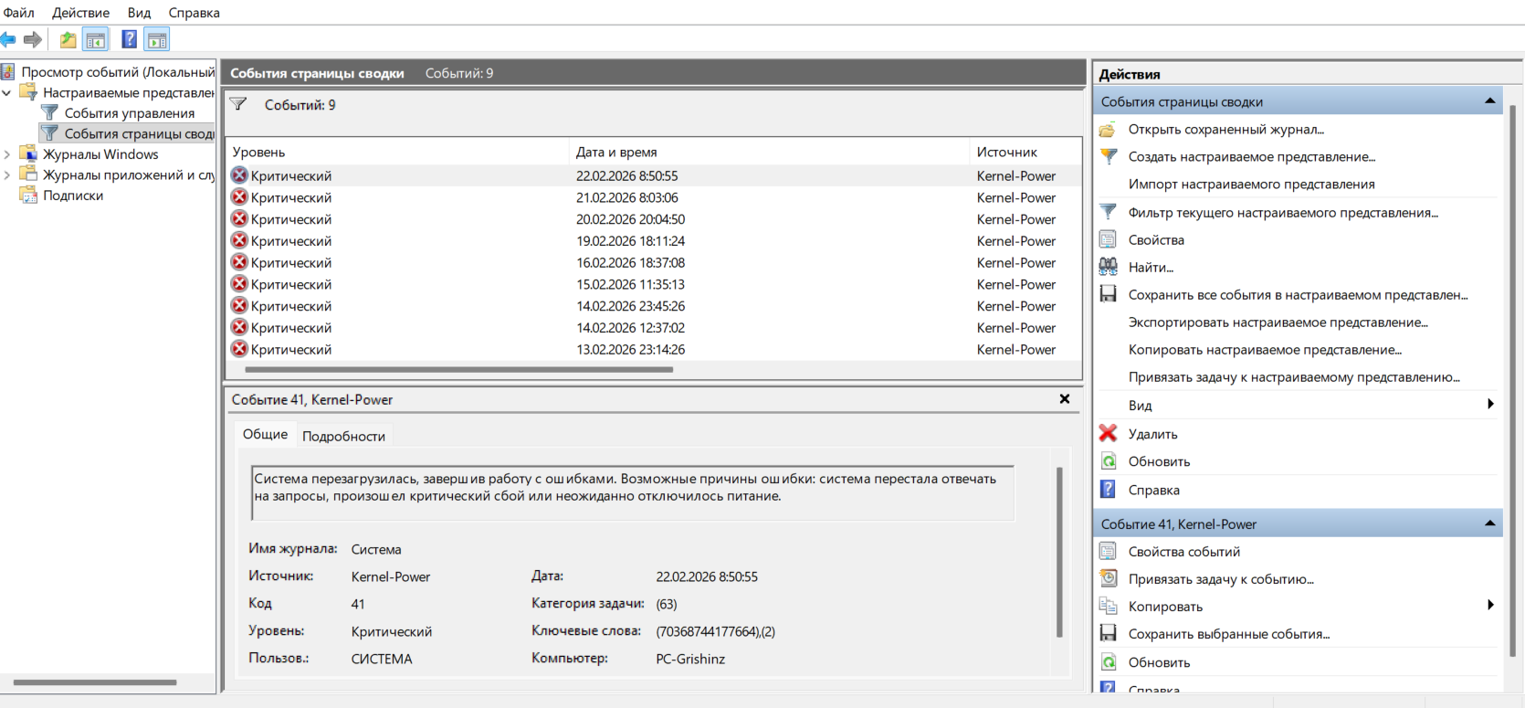 в журнале событий отражается ошибка Kernel-Power 41(63), скриншот ниже, температуры процессора и видеокарты в игре по 60 градусов.