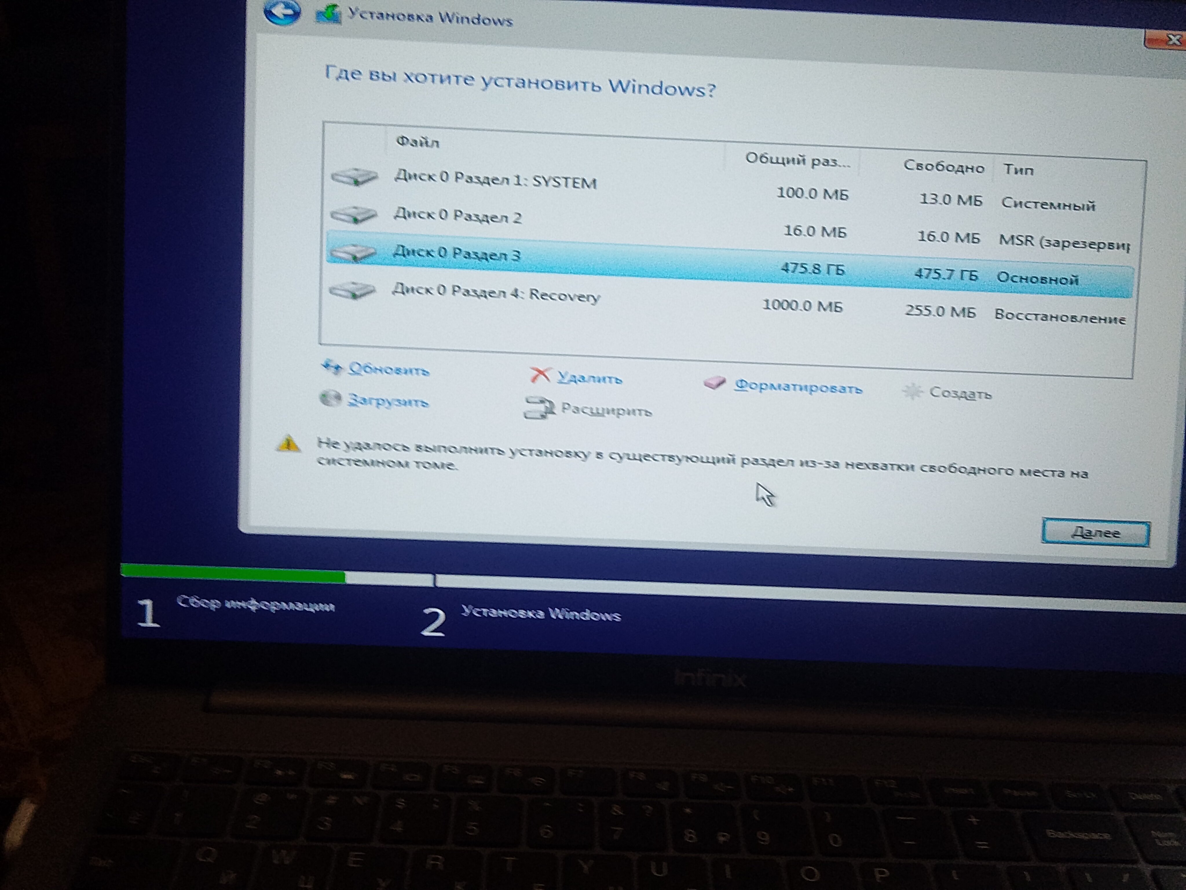 Ошибка при установке Windows на ноутбук Digma Pro – недостаточно свободного места