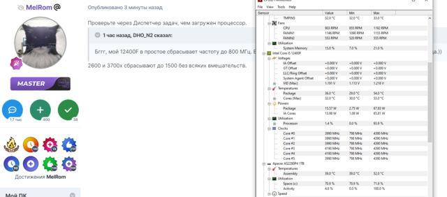 Бггг, мой 12400F в простое сбрасывает частоту до 800 МГц. Безо всяких вмешательств с моей стороны. Покупайте Интел, господа.))