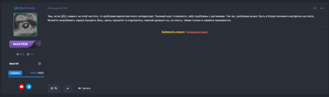 Увы, если GPU «завис» на этой частоте, то проблема вероятнее всего аппаратная. Токовый шунт отвалился, либо проблемы с датчиками. Так же, проблема может быть в блоке питания и мосфетах на плате.