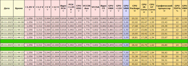 Напряжения в норме. У меня есть записи логов AIDA64, полученные непосредственно перед зависаниями системы (примерно неделю назад). Прикрепляю...
