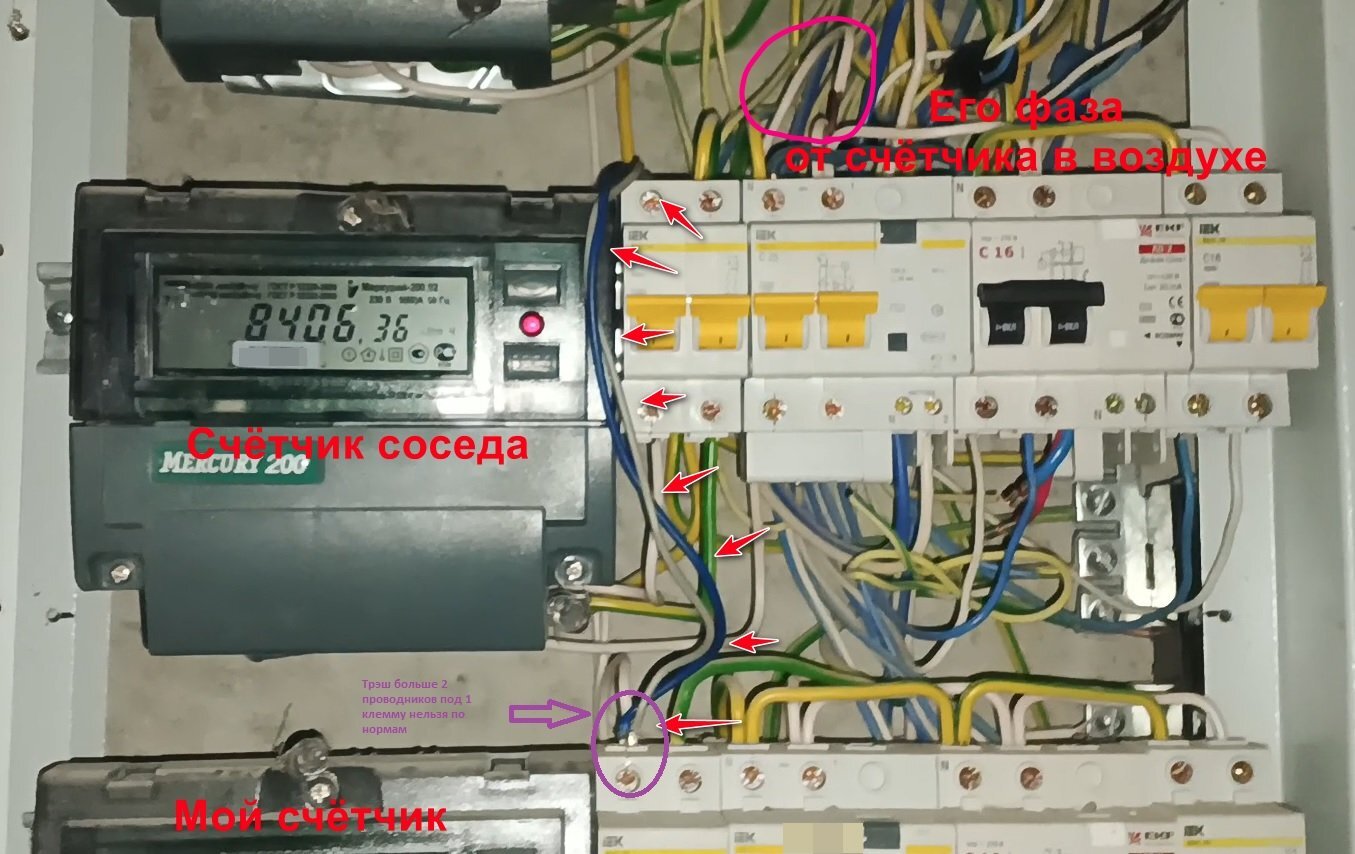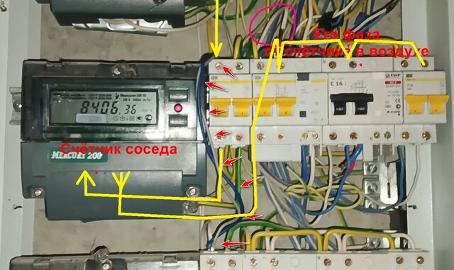 От моего автомата (тот, что после счётчика) идёт «сопля» до соседских автоматов. Притом, его фаза от счётчика просто висит в воздухе. Понятно, что идиот решил стырить киловатты, но получилось ли? Месячное потребление кВт не изменилось, а этой «сопле» между пакетниками уже больше месяца. Я так глянул, на его счётчике тоже потребление не стоит, а значит ток считается по нулю.