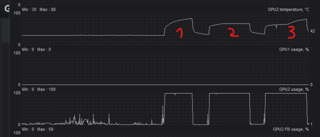 69-74 градуса и 80-90 в хотспоте, при 200-300w потреблении